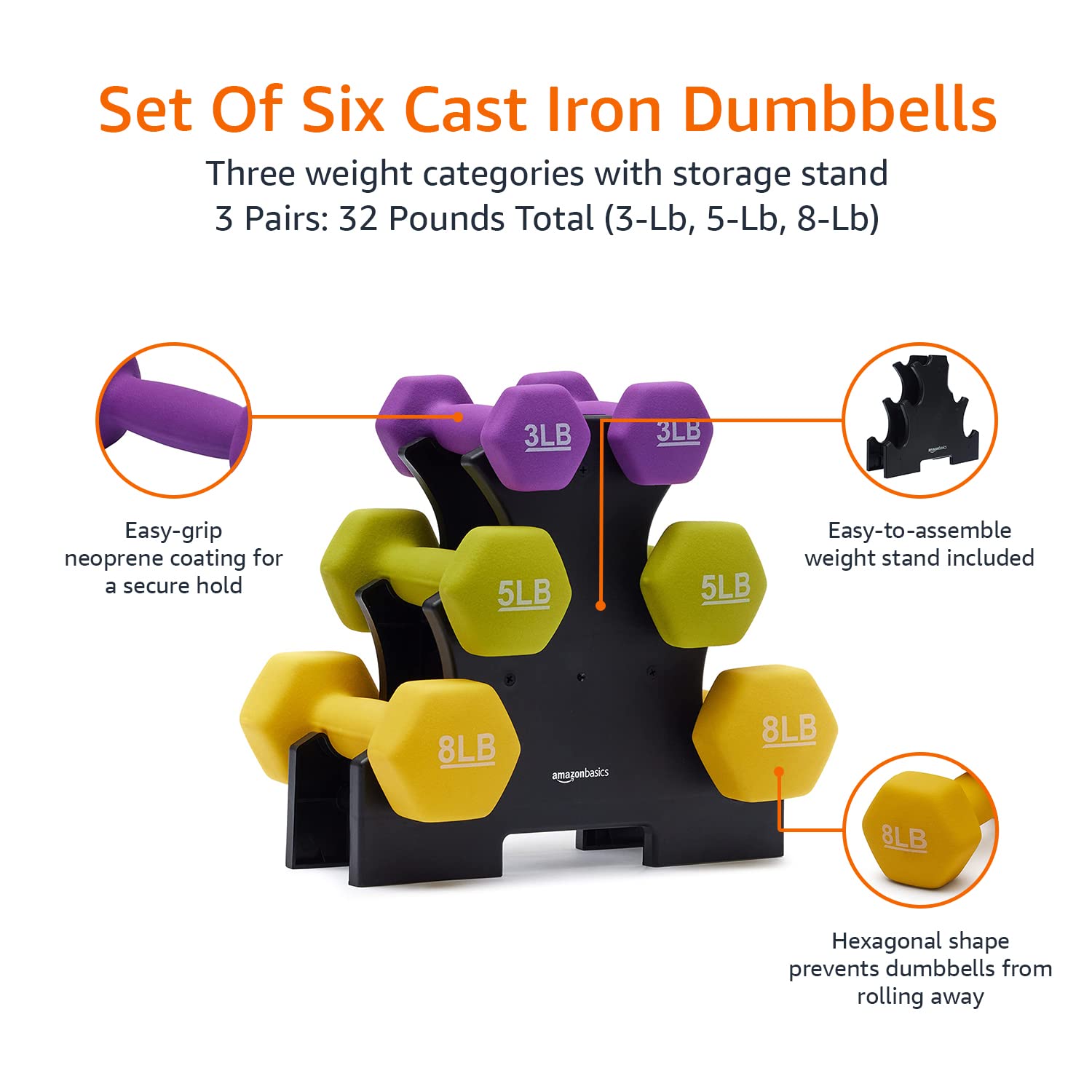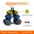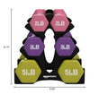 - 2 each: 2, 3, and 5 pound dumbbells (6 total) for exercise and strength training, plus an easy-to-assemble storage stand