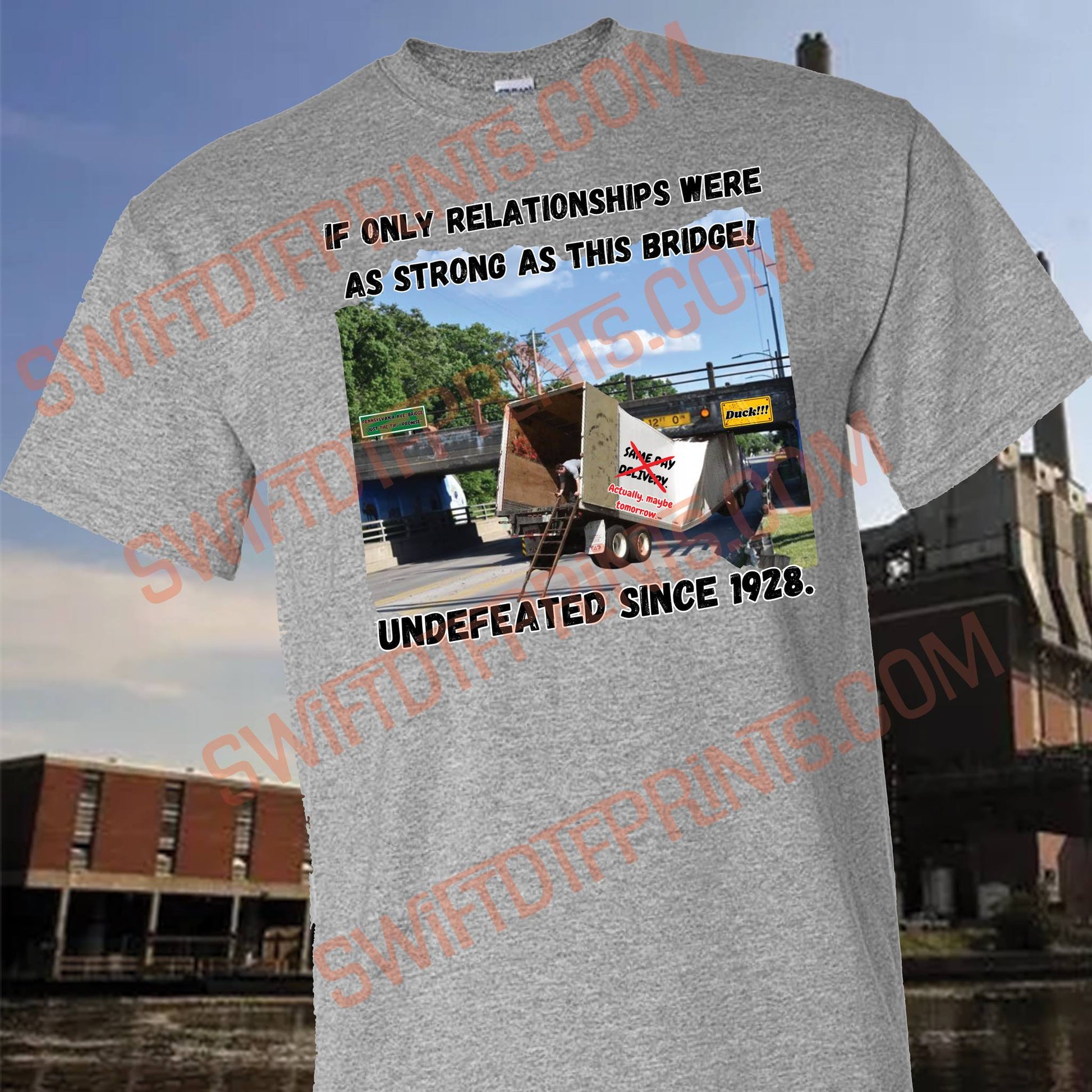 Show your love for Lansing with this Gildan gray t-shirt featuring a picture of the infamous Pennsylvania Street Bridge. Known for its undefeated streak since 1928, this shirt is a must-have for any local or tourist! *** You can request a different color in the notes when you check out. Black, Yellow, White, Green, Purple, Pink, Orange, Red or Blue. All shirts are made with unisex Gildan Brand Heavy Blend Cotton Shirts.